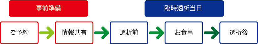 ご施設より、予定日の1週間前までに「透析条件」「診療情報提供書」「直近3回の透析記録」のFAXをお願い致します。