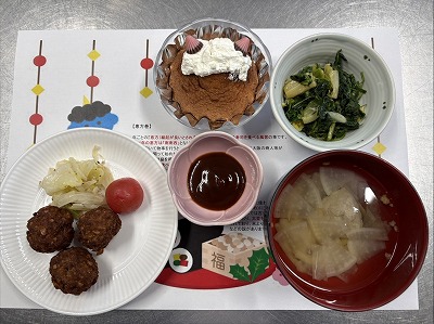 | ミートボール 鰯のつみれ汁 磯部和え 白米 節分マドレーヌ |