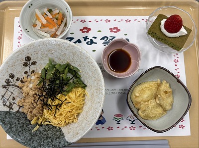 | 三色丼 芋天 胡麻酢和え ひな祭りケーキ |